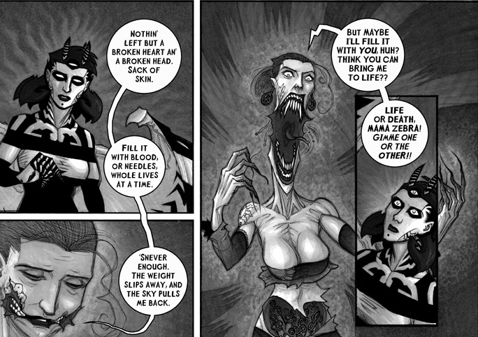 Originally a comedic webcomic about a mild mannered college graduate who was suddenly transformed into a demon, it slowly turned into a wonderful urban fantasy series where every character eventually find their own supernatural niche (wizard, werewolf, talking book, etc). The tone instantly reminds me of RPG’s like the Chronicles of Darkness as you dive deep into a world of dark creatures and malevolent forces that live just beyond human perception. Plus, the art is perfect for the series. The author uses black and white drawings to help convey a dark world that humans are unlucky enough to live in. Â