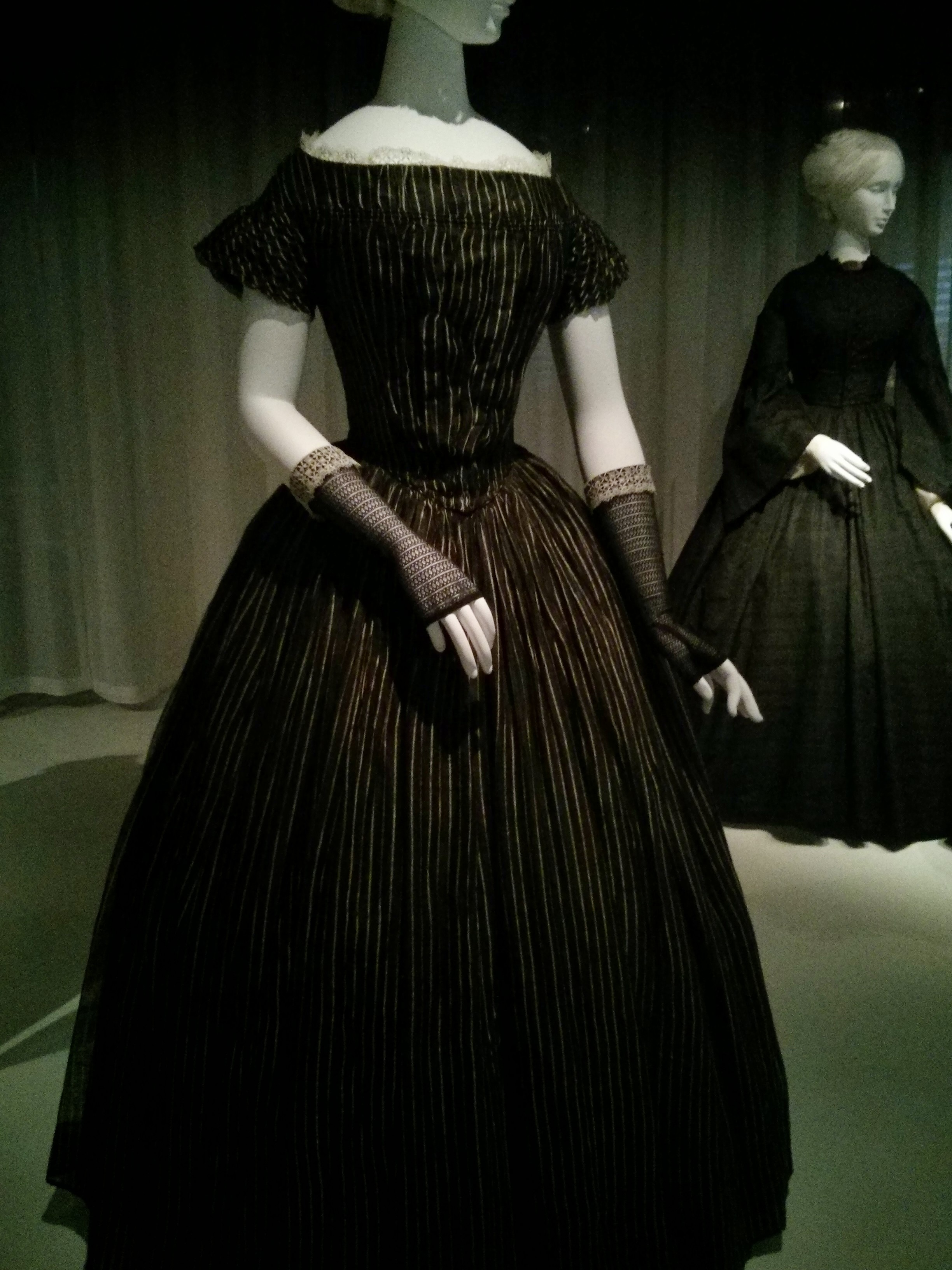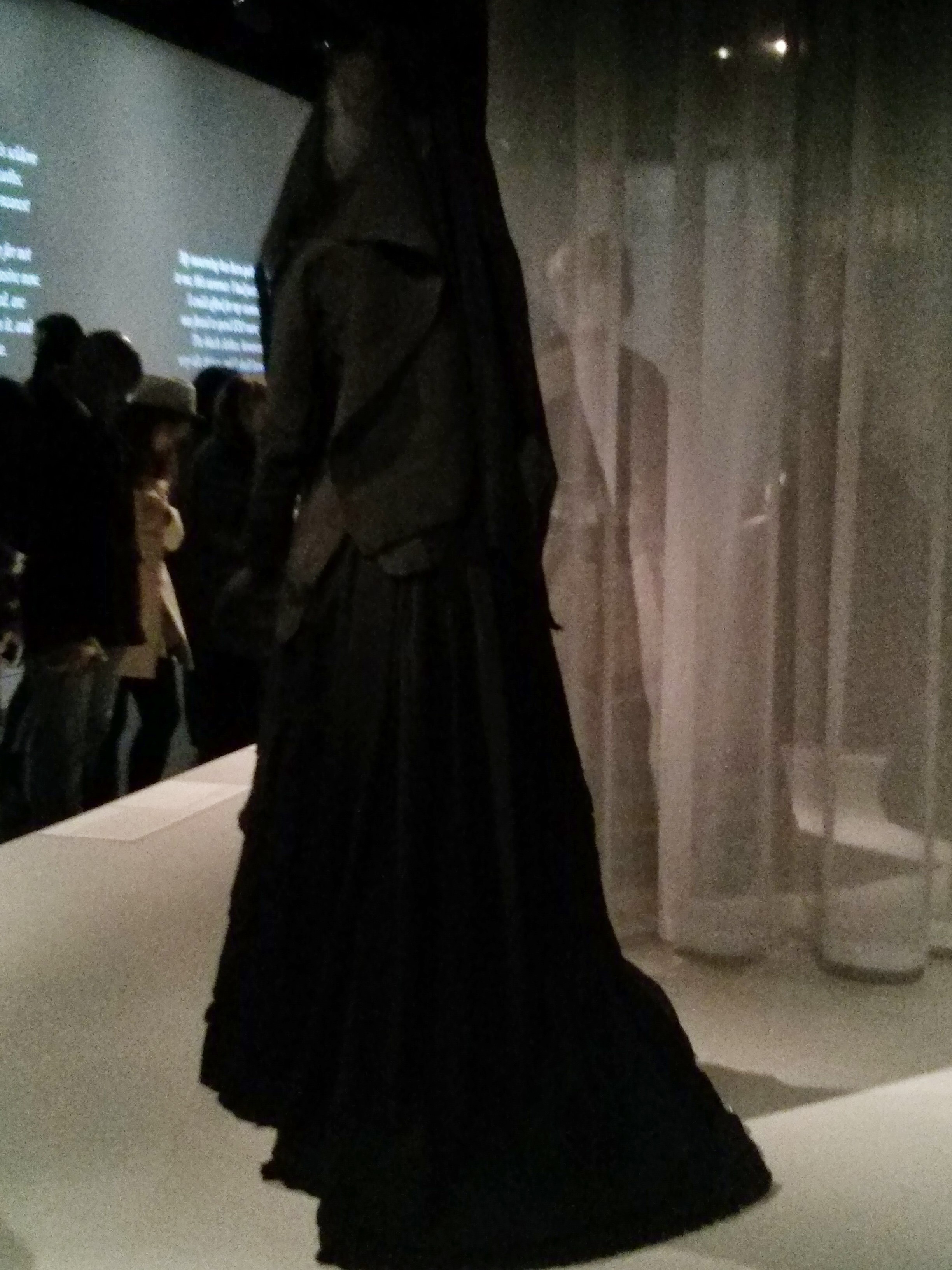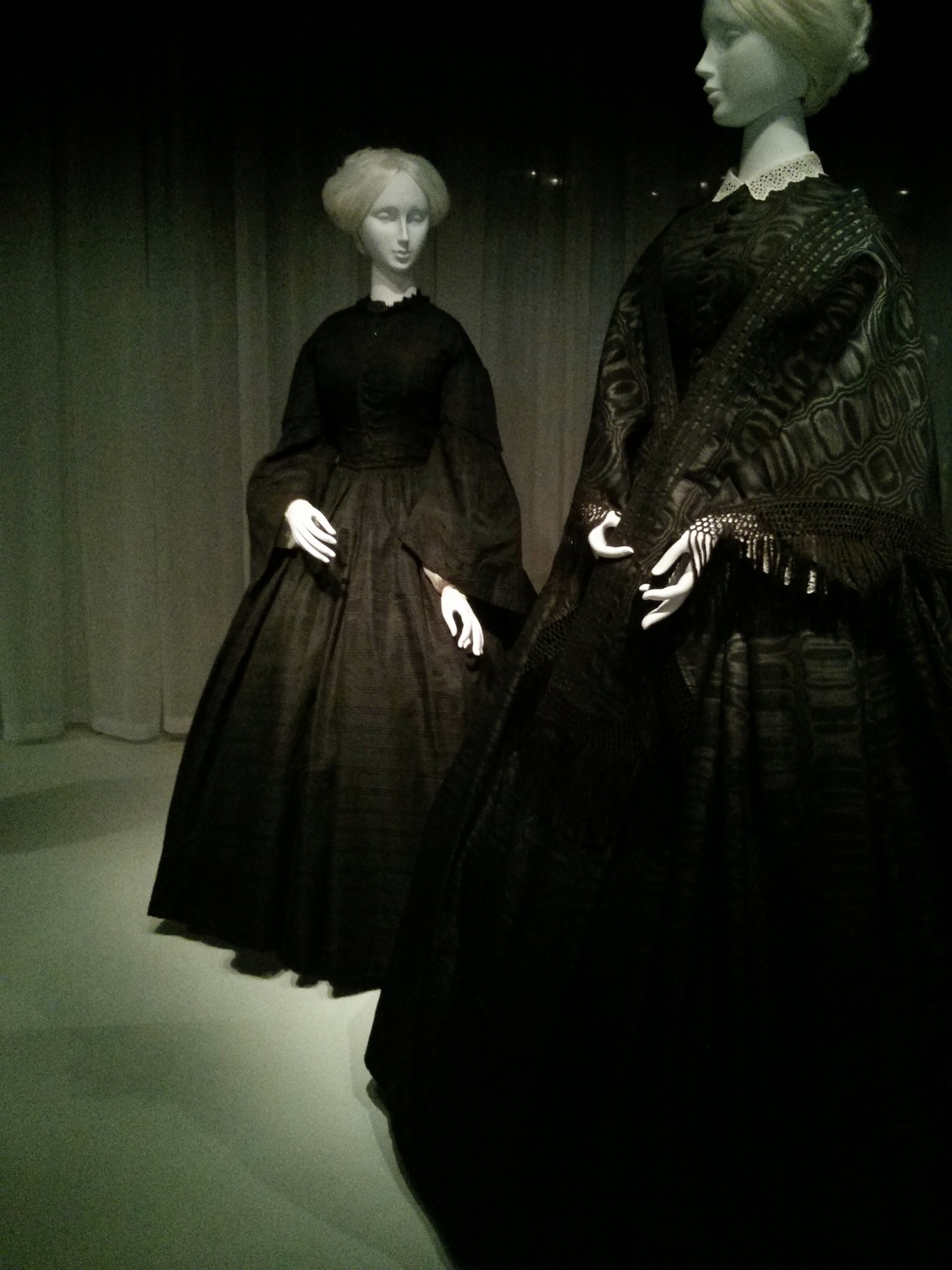 This fall the Metropolitan Museum of Art has hosted an excellent exhibit in the Costume Institute: Death Becomes Her: A Century of Mourning Attire, about the mourning traditions of the Victorian era. When a coworker told me about, I about had a nerd-gasm, and Billy and I were traipsing up to the museum practically the next weekend. For anyone with an interest in historical fashion, it’s a must-see stop (but hurry! It’s only on display through February 1st!). The exhibit gave me lots of new inspiration for Moira in Unhallowed Metropolis, especially considerations of what to do with her fashion as she moves farther from the British culture that raised mourning to an art form.
