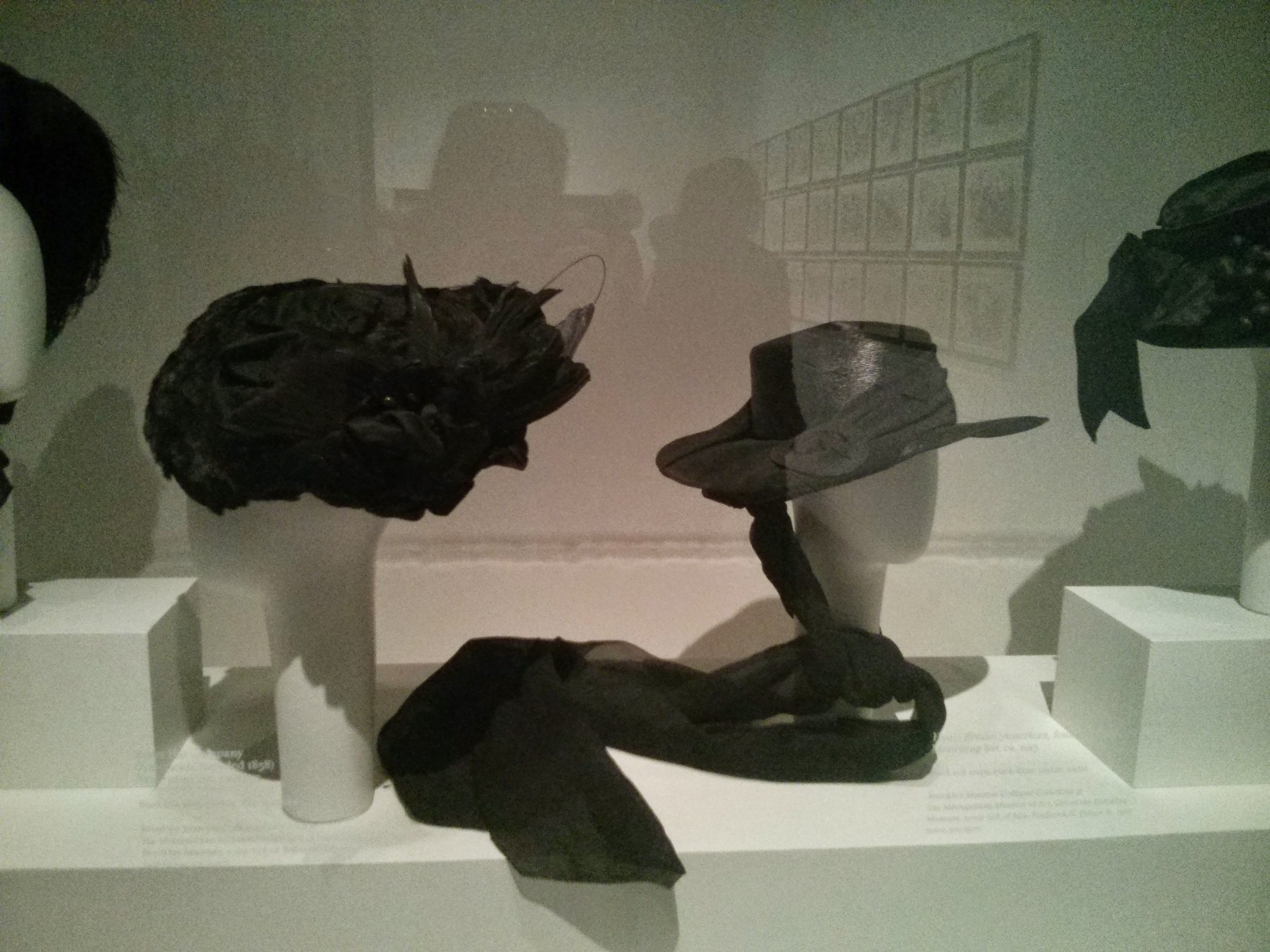 The exhibit leads through over a century of mourning fashion, focusing heavily on women’s fashions, as women were expected to bear the brunt of mourning for the family. I focused on many of the fashions of the latter-half of the 19th century for my research for Moira, as the illustrations in the Unhallowed Metropolis book seem to draw from the narrower silhouettes of the time. These are just a handful of the photos I took – turns out black fashion is difficult to photograph on a cell phone in a dim room.