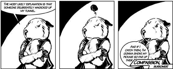 Coming from a race of intelligent wombats who excel at science and engineering, the main character, Digger, hates magic and all the craziness associated with it. Which of course means that when she finds herself stuck in magical land full of wild creatures and wilder magic, she is going to have one hell of a terrible time. Stuck in a village full of religious zealots and talking statues, Digger has to find a way home while also going on a really irritating magical quest. Â The comic is complete, so if you want something to read through on a lazy afternoon, you might want to consider Digger.