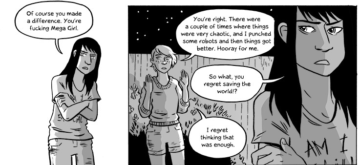 Something Positive is a funny, pessimistic, yet also strangely uplifting slice of life comic about a group of snarky friends in a fairly cynical universe. Originally focused on Davan Macintyre, a Texan born native who moved to Boston, it has expanded to a plethora of characters who slowly change and grow over time. What’s great about the comic is how bizarre yet strangely down to earth it can become. On one hand, you can laugh as a whole convention is slaughtered by an army of preteen cat girls. On the other, a death can come out of nowhere to give you one hell of a gut punch. And fans of the comic will know exactly what death I’m talking about. Which only shows how well-rounded the characters become and how well written the comic is overall. If you want to laugh, to cry, and to have quite a few dark and snarky comments to add to your repertoire, consider Something Positive. Â Â